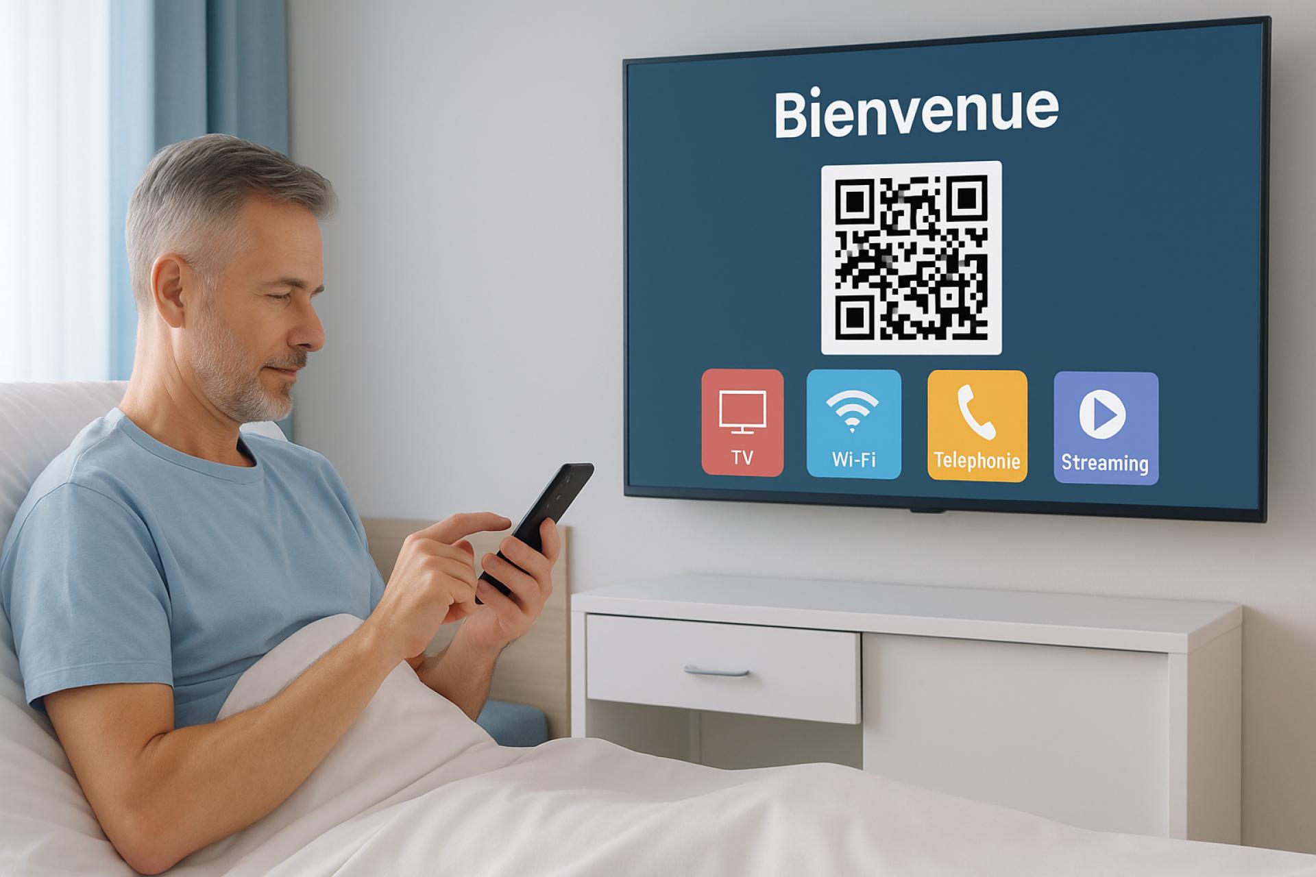 Depuis leur chambre, les patients peuvent désormais gérer leurs services TV, Wi-Fi ou téléphonie via un QR code affiché sur la chaîne d’accueil :